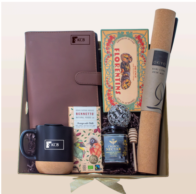 Turn any workspace into a statement of elegance and focus. This premium executive gift set features thoughtfully curated essentials — from the sleek Cesis Executive B5 Planner to a personalised cork desk pad and the stylish Serendipio Sienna cork ceramic mug. Complemented by indulgent treats like chilli-orange chocolate, salted-caramel milk chocolate, pure Acacia honey, and a classic honey dipper, all beautifully arranged on a marble tray.